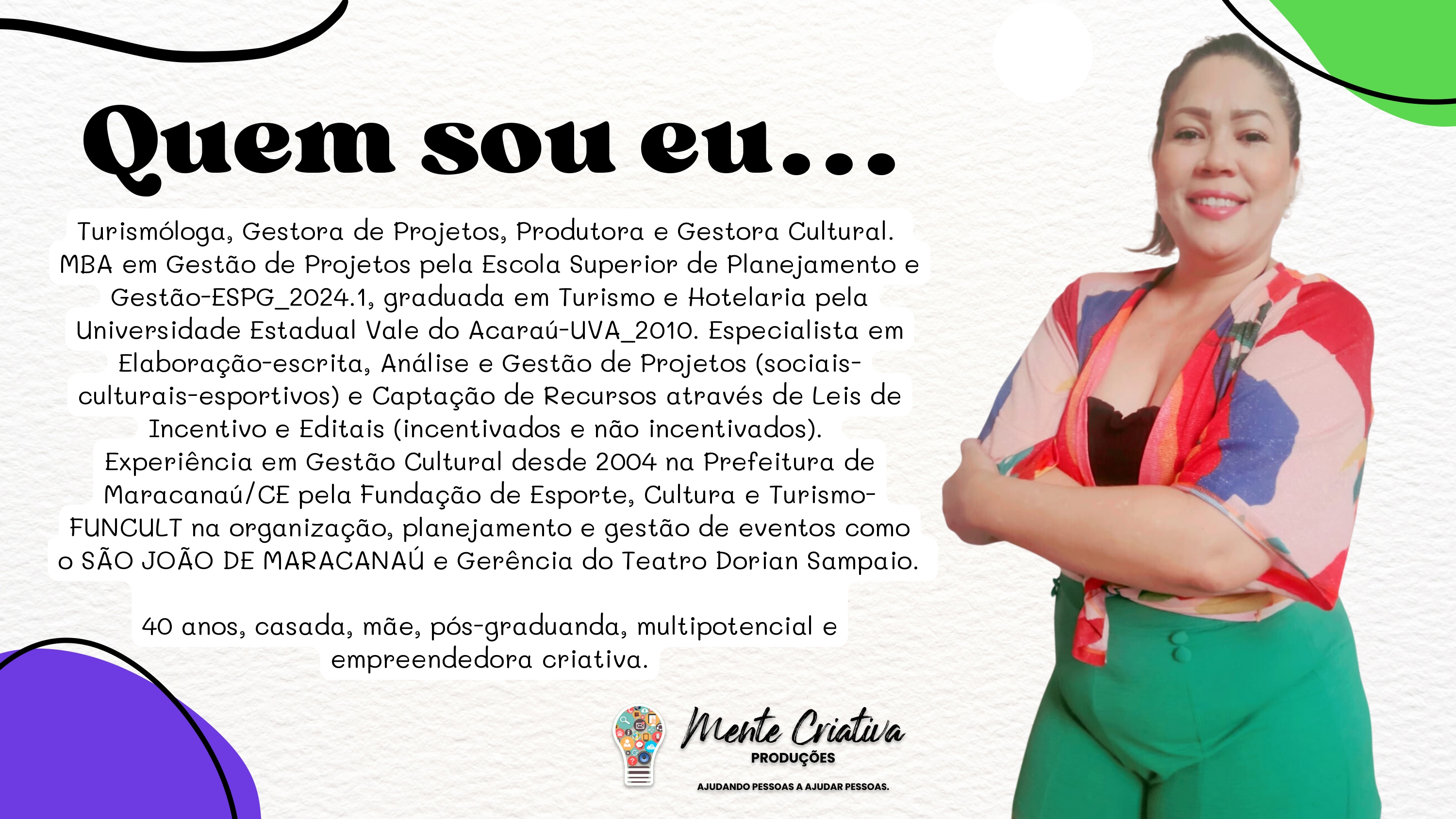 Turismóloga, Gestora de Projetos, Captadora de Recursos, Pesquisadora, Produtora e Gestora Cultural. Fundadora e CEO da Mente+Criativa Produções, Negócios e Projetos Sustentáveis LTDA. Pós-Graduanda em Política e Gestão Cultural pela Universidade Federal do Recôncavo da Bahia-UFRB_2028.1. MBA em Gestão de Projetos pela Escola Superior de Planejamento e Gestão-UNIESPG_2025.1. Graduada em Turismo e Hotelaria pela Universidade Estadual Vale do Acaraú-UVA_2010.> Especialista em Elaboração-escrita, Análise, Adequação, Adaptação, Gestão Estratégica e Prestação de Contas de Projetos de Impacto Sociais, Culturais, Esportivos, Socioambientais e Empreendedorismo Criativo.