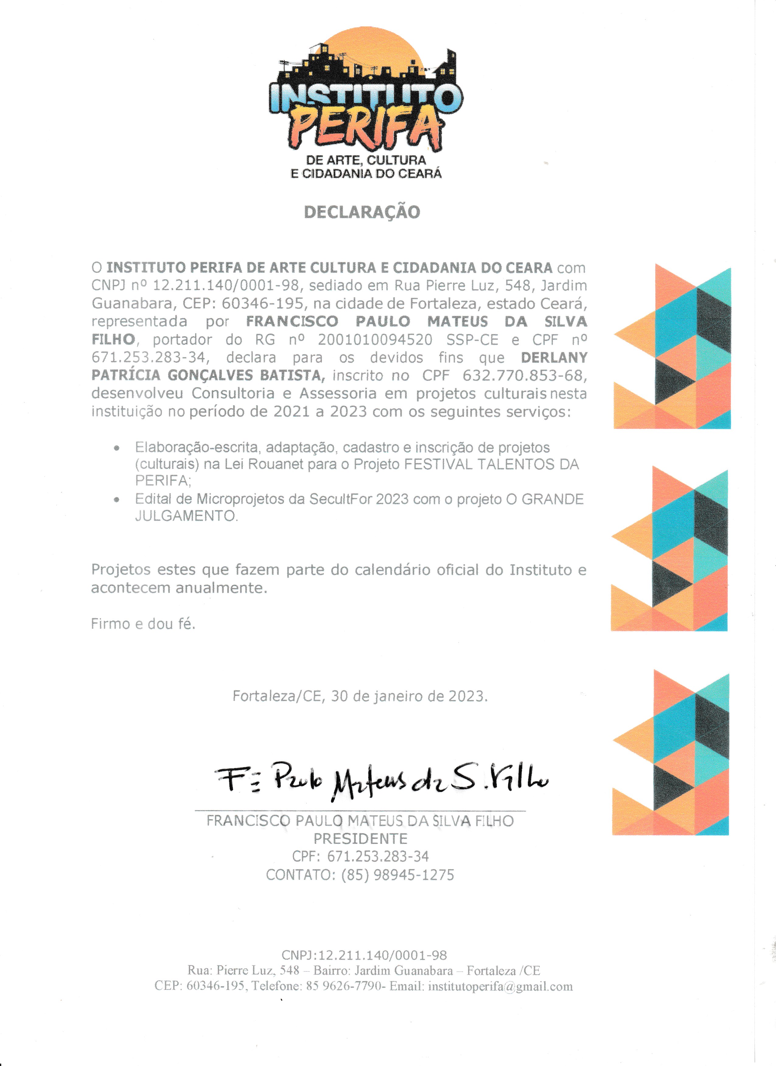 > Experiência em Gestão Cultural desde 2004 na Prefeitura de Maracanaú/CE pela Fundação de Esporte, Cultura e Turismo-FUNCULT na organização, planejamento e gestão de eventos culturais como o SÃO JOÃO DE MARACANAÚ e