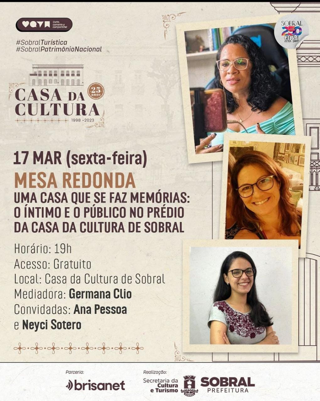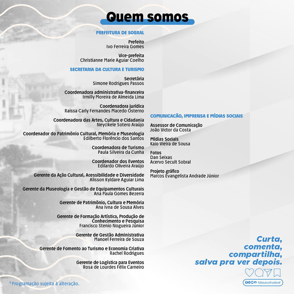 Sou graduada em História e em Administração pela Universidade Estadual Vale do Acaraú-UVA. Tenho pós-graduação em Ensino de História do Ceará pela Universidade Estadual Vale do Acaraú- UVA, bem como pós-graduação em Gestão Pública Municipal pela Universidade Aberta do Brasil-UAB/Universidade Estadual do Ceará-UECE. Atuei como educadora cultural na Casa do Capitão-Mor: centro de referência histórica e cultural de Sobral, equipamento da Secretaria da Cultura e Turismo de Sobral-CE (2008-2019). Também atuei como gerente de museologia e patrimônio cultural (2019-2020) e como coordenadora de Artes, Cultura e Cidadania na Secretaria da Cultura e Turismo de Sobral-CE (2021-2023). Sou articuladora cultural no Coletivo Ágora Chaval-CE. E Mestra em Artes, Patrimônio e Museologia pela UFDPar.