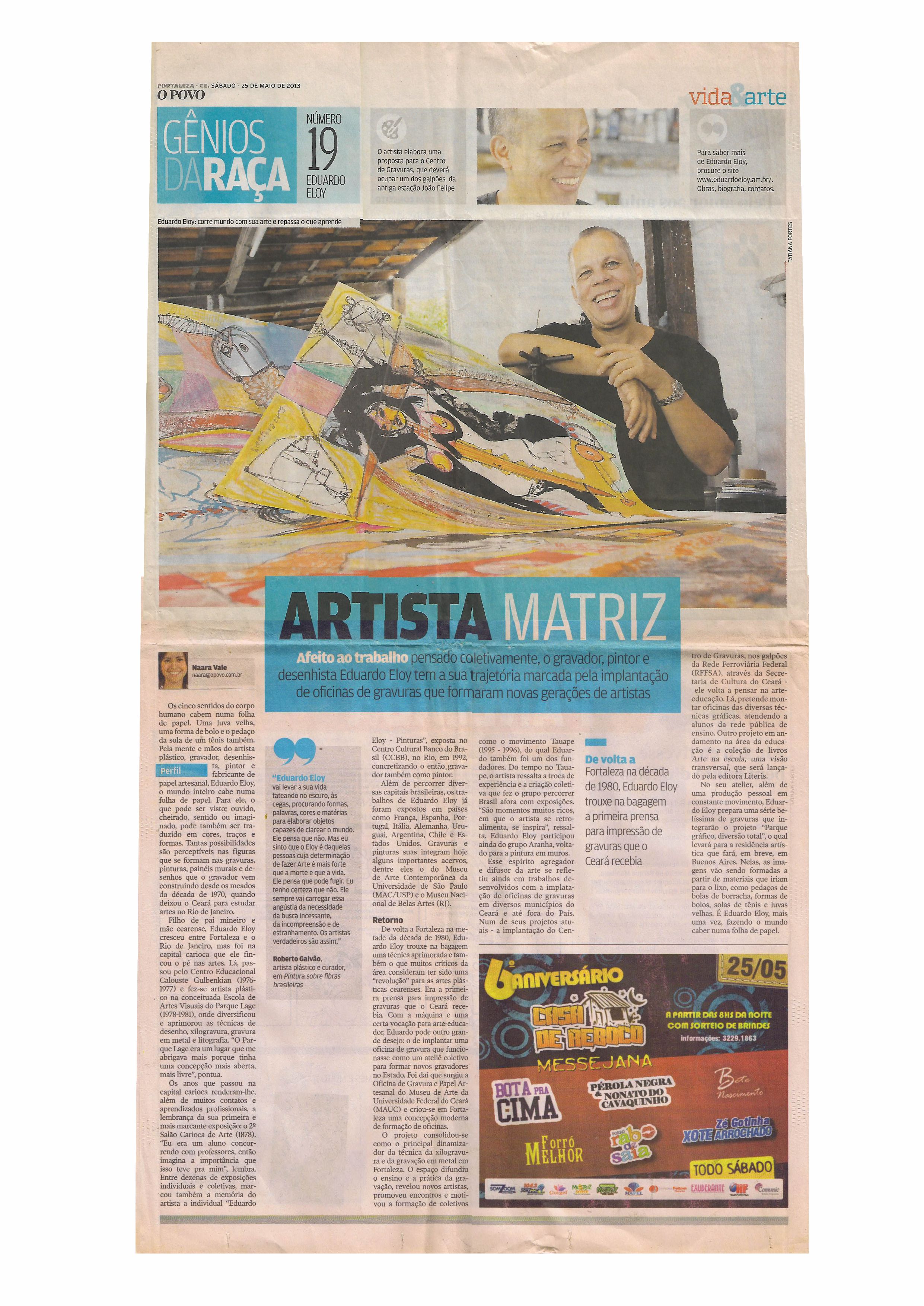 A trajetória profissional de Eduardo Eloy é extensa seja como artista visual ou professor de artes gráficas. E se inicia com a gravura tradicional (xilogravura, gravura em metal e litografia) até chegar noutras elaborações visuais como o desenho, pintura, técnicas místicas e impressões digitais.Para o artista visual, mesmo a gravura sendo uma prática histórica da arte universal, ela atualmente passa por várias transformações estéticas para encontrar novos caminhos através de pesquisas e elaborações artísticas contemporâneas, sem no entanto, perder seus traços que nos remete a nossa ancestralidade e sua importância cultural, principalmente, no Nordeste brasileiro. Consciente do valor da gravura como manifestação artística imbricada à cultura brasileira, Eduardo Eloy vêm articulando desde a sua formação nos anos 1980 na Escola de Artes Visuais do Parque Lage (RJ), uma trajetória artística própria, onde o processo criativo é elaborado visualmente com uso dos mais variados materiais gráficos coletados e ressignificados em novas propostas. Nesse sentido, seu trabalho busca apresentar uma visualidade rica para os sentidos, onde as cores e a plasticidade se integram. Por outro lado, Eduardo Eloy procura integrar o seu fazer artístico como um meio catalizador dos saberes, relacionando-o a práticas do exercício da cidadania e da sustentabilidade, valores intrínsecos não apenas em sua produção artística, mas também, como professor de artes gráficas. Dessa forma, a história profissional de Eduardo Eloy, que tem nas artes gráficas o fio condutor para seus diversos processos criativos, vai além do fazer artístico tornado-se uma trajetória que intercala a produção visual as ações socioeducativas, onde o artista vêm contribuindo de forma relevante para a inserção e integração de novos artistas no diálogo com a arte por meio da criação de ateliês que organizou, e dos muitos cursos que ministrou e coordenou em mais de 30 anos, seja de níveis técnicos ou acadêmicos. Com isso, Eduardo Eloy busca a construção de afetos como transformação da sua experiência artística, visando produzir um espaço integrador entre a experiência estética e a experiência educativa, contribuindo assim, para o enriquecimento sociocultural e sócio afetivo do seu público e de seus alunos. Dessa maneira, o artista busca estimular com seu trabalho novas formas de agir e compreender o mundo através da arte, um campo permeado por relações de significados diversos que se estabelecem como experiências transformadoras das relações humanas.Currículo