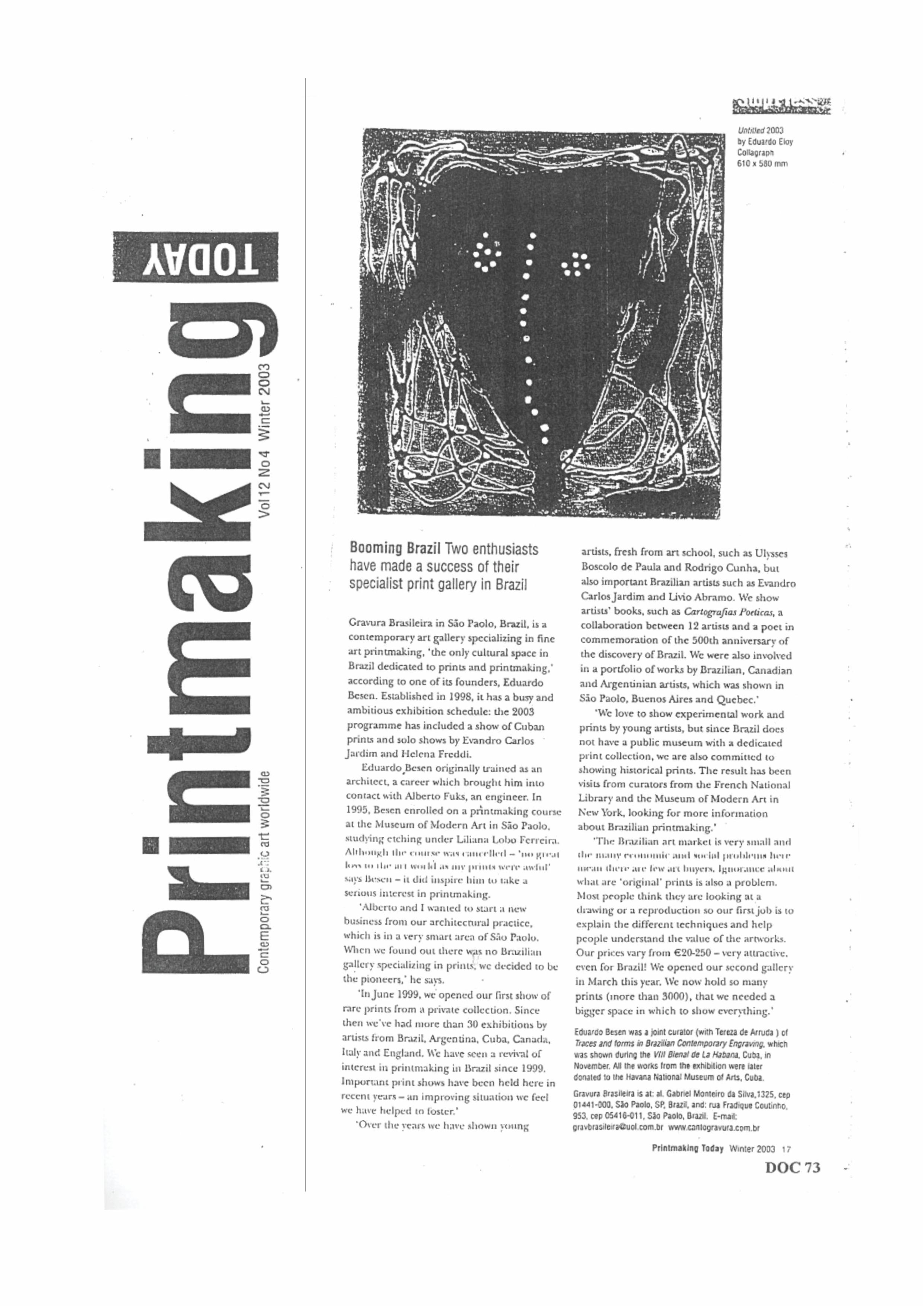 • 2003 Revista Printmaking Today, Londres.