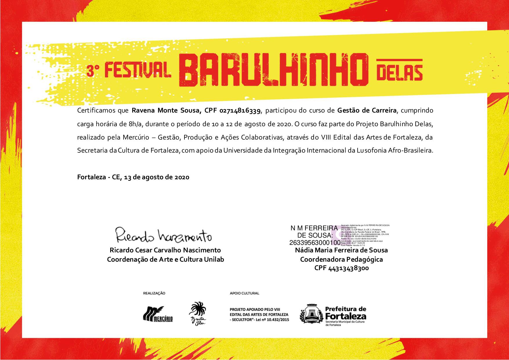 Bolsista Técnica em Produção na Feira Cariri Criativo - da UFCA (2015-2016); Coordenadora de Palco no Festival Barulhinho 2ª edição, da Mercúrio - Gestão e Produção, no Dragão do Mar (2017).