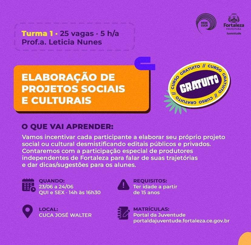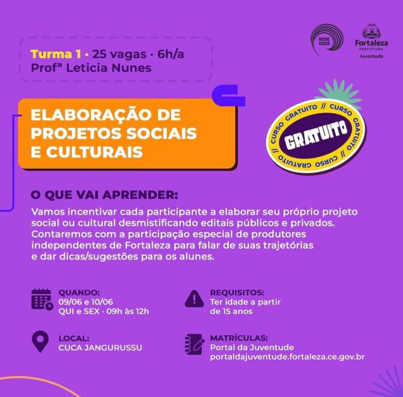 Produtora cultural, fotógrafa e educadora popular. Minha trajetória passa pela criação e realização de projetos nas áreas do audiovisual, da educação e da cultura popular, sempre com um olhar atento para os territórios e as juventudes.Ao longo dos últimos anos, atuei em diferentes frentes: como produtora executiva e artística, fotógrafa, comunicadora, brincante e ministrante de oficinas. Tenho experiência com elaboração de projetos, formação de jovens, edição de vídeos e cobertura de eventos culturais — especialmente através de iniciativas desenvolvidas com a Rede Cuca, na qual atuei como Assistente de Comunicação e de projetos contemplados por editais como a Lei Paulo Gustavo e a Lei Aldir Blanc.